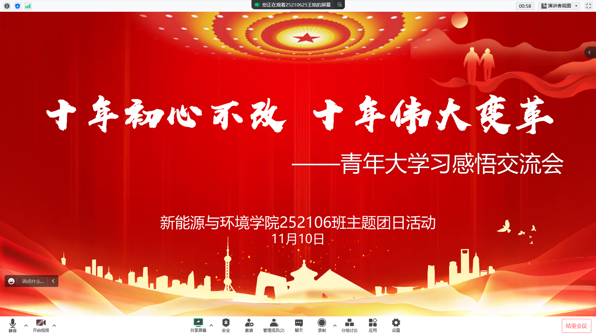 通过学习党的二十大精神和回顾新时代十年伟大变革,各支部青年团员结合自己的学习感悟与体会。252023团支部刘泽群同学表示:中国特色社会主义进入新时代,广大青年必须不断学习,才能跟上时代前进的脚步,才能融入民族复兴的伟业。如果不能主动加快知识更新、优化知识结构、拓宽眼界和视野,就无法赢得主动、赢得优势、赢得未来。252105团支部多位同学踊跃发言,不仅表达了学习青年大学习对我们的重要意义,还表达了我辈青年应积极响应党的号召,让青春在全面建设社会主义现代化国家的火热实践中绽放绚丽之花。