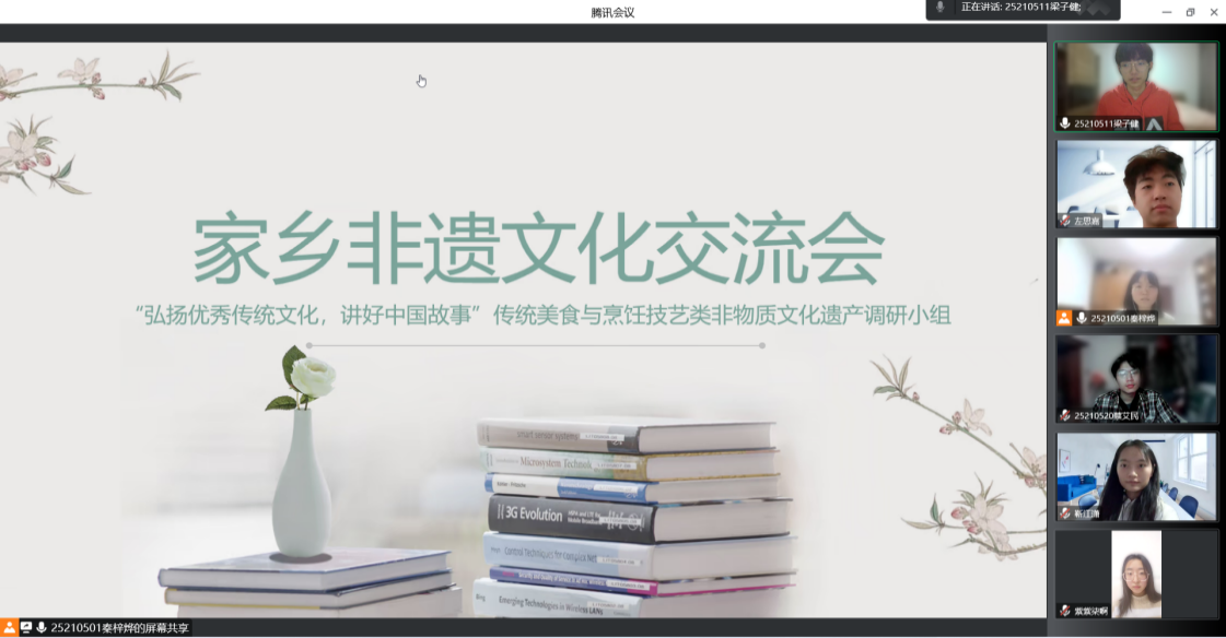 在2022年12月25日到2023年1月10日,同学们通过书籍、网络和视频,自主学习了非物质文化遗产的内涵与特点,对家乡所在城市的非物质文化遗产名录内容有了大致了解,对后续实践调研的开展也制定了初步的计划。随后,1月13日晚上,项目组同学们在腾讯会议线上会议室举办了“家乡非遗文化交流会”。会议上,来自5个不同城市的同学展示了家乡特有的非物质文化遗产。来自山西长治的秦梓烨同学为我们介绍了地方剧种上党梆子,传统手艺黎侯虎、上党堆锦以及传统美食潞城甩饼、荫城猪汤、襄垣手工挂面等。左思嘉同学则展示了家乡久负盛名的美食“Biangbiang面”,皮影戏曲剧种华阴老腔等陕西非物质文化遗产。随后,通过梁子健同学的讲解,我们又了解了吉林长春的非物质文化遗产松花砚微雕、古车模型制作技艺以及长春高跷等。而通过刘雨萌同学的PPT展示,我们又看到了延吉特色的朝鲜族语言、舞蹈、美食,特别是风靡全国的石锅拌饭。关于江西南昌的非遗文化,蔡艾民同学介绍了大唐东坡肉、松湖米粉、瓦罐煨汤等美食以及万寿宫文化等。除此之外,李梦琦同学和靳江潇同学也对本次实践活动提出倡议,号召同学们通过视频记录实践过程和成果,更好地宣传家乡非遗文化。