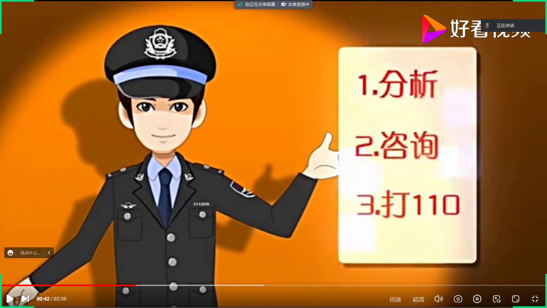 会议中,团支书共享屏幕和同学们一起观看防诈骗宣传视频。在一共观看了3个视频后,团支书讲解如何防诈骗的具体做法。通过PPT的形式向同学们展示该内容。