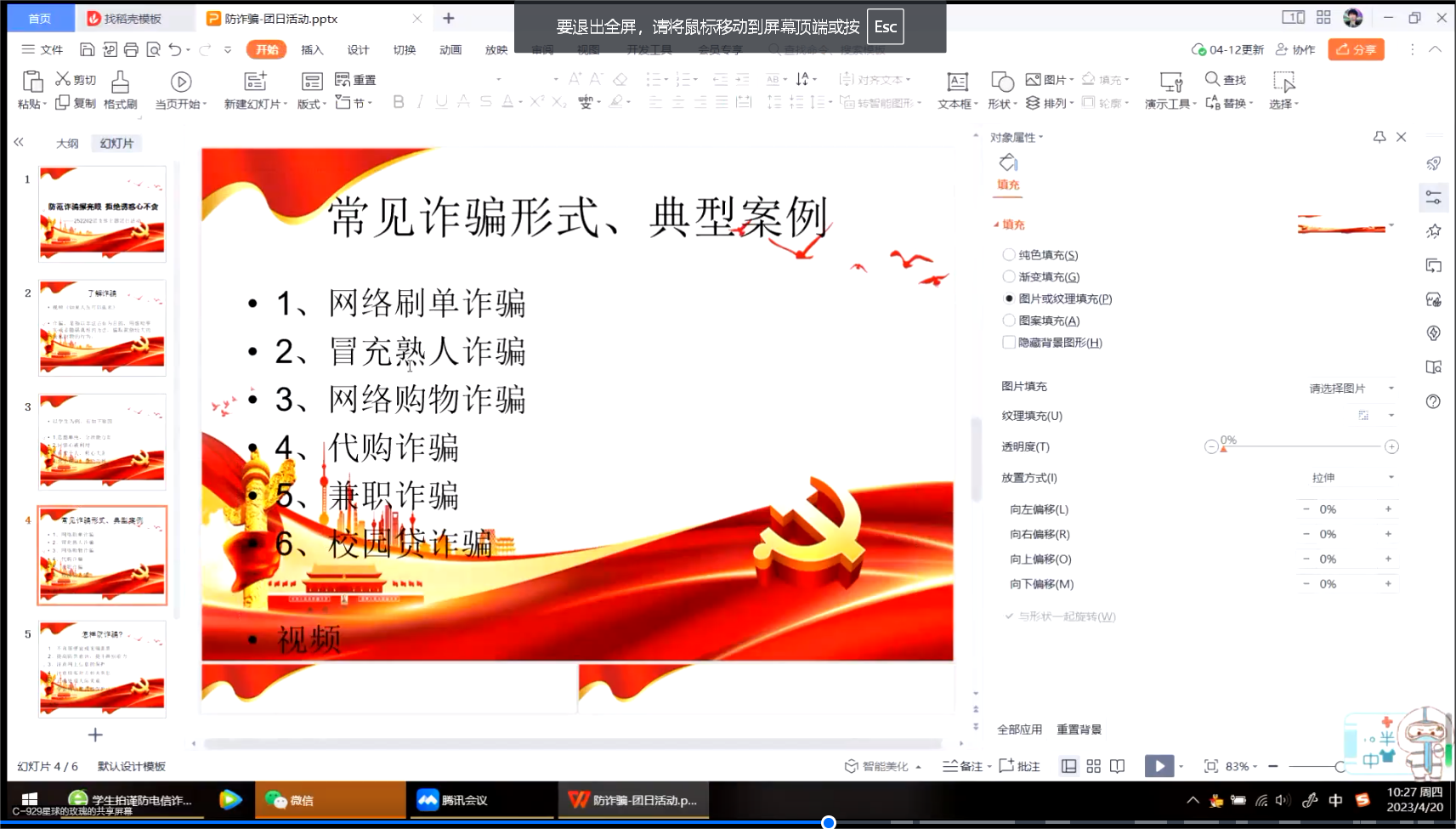 首先团员李金科分享了他曾差点被来路不明的短信诈骗的经历,勾起了大家浓浓的兴趣。团支书郭诗语为大家播放了视频短片《如果人生可以重来》,向大家讲解什么是诈骗,引入了今天的主题。