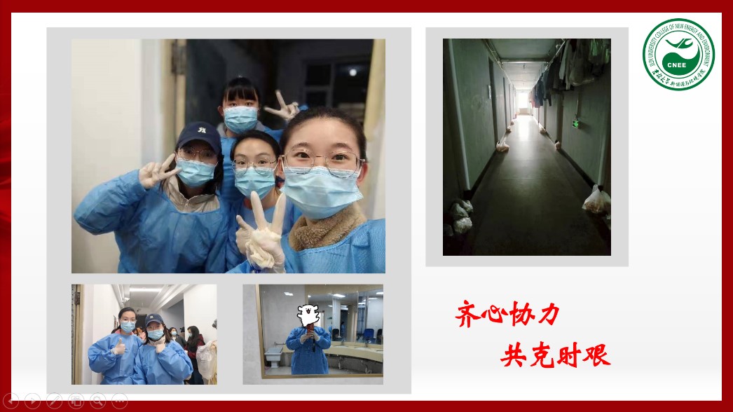 活动伊始,党支部组织委员兼宣传委员牛梦圆同学带领大家一起学习了《致全省各级党组织和广大共产党员的一封信》以及《致全校各级党组织和广大党员的倡议书》。随后,四位党员志愿者代表分别分享了自己的战疫故事。孟益坎同学向大家展示了几组图片,讲述了自己从看到老师同学们积极参与疫情防控到自己和室友们一起参与防控的故事,分享了自己在清晨为大家发放完早餐后获得的自豪和光荣。她用“聚是一团火,散是满天星”形容一直奋战在校园疫情防控第一线的志愿者。一直驻校工作的钟宇博老师也分享了他这段时间的工作感受,他最后说“我们终会在春暖花开的校园里,迎接海角社区