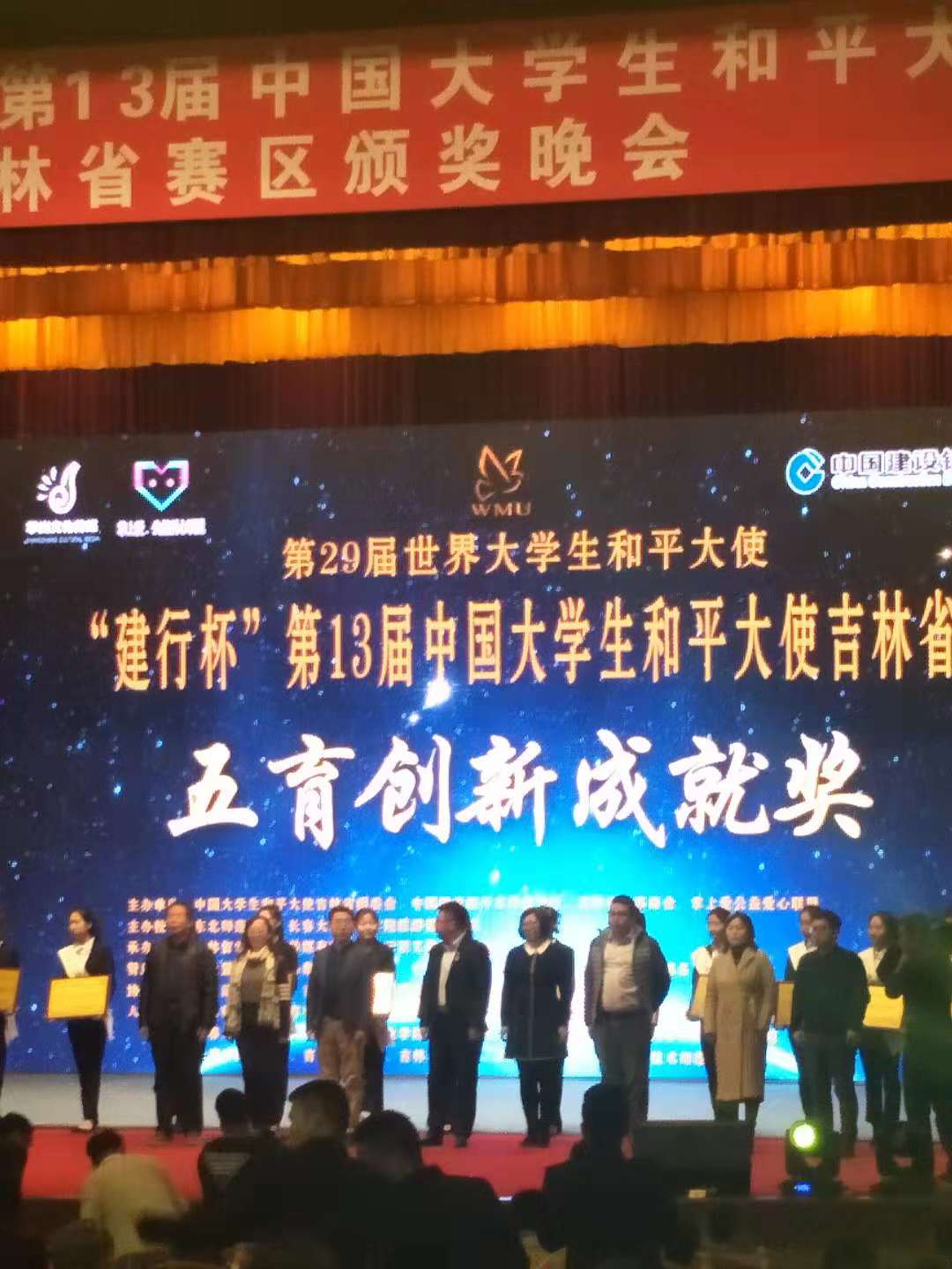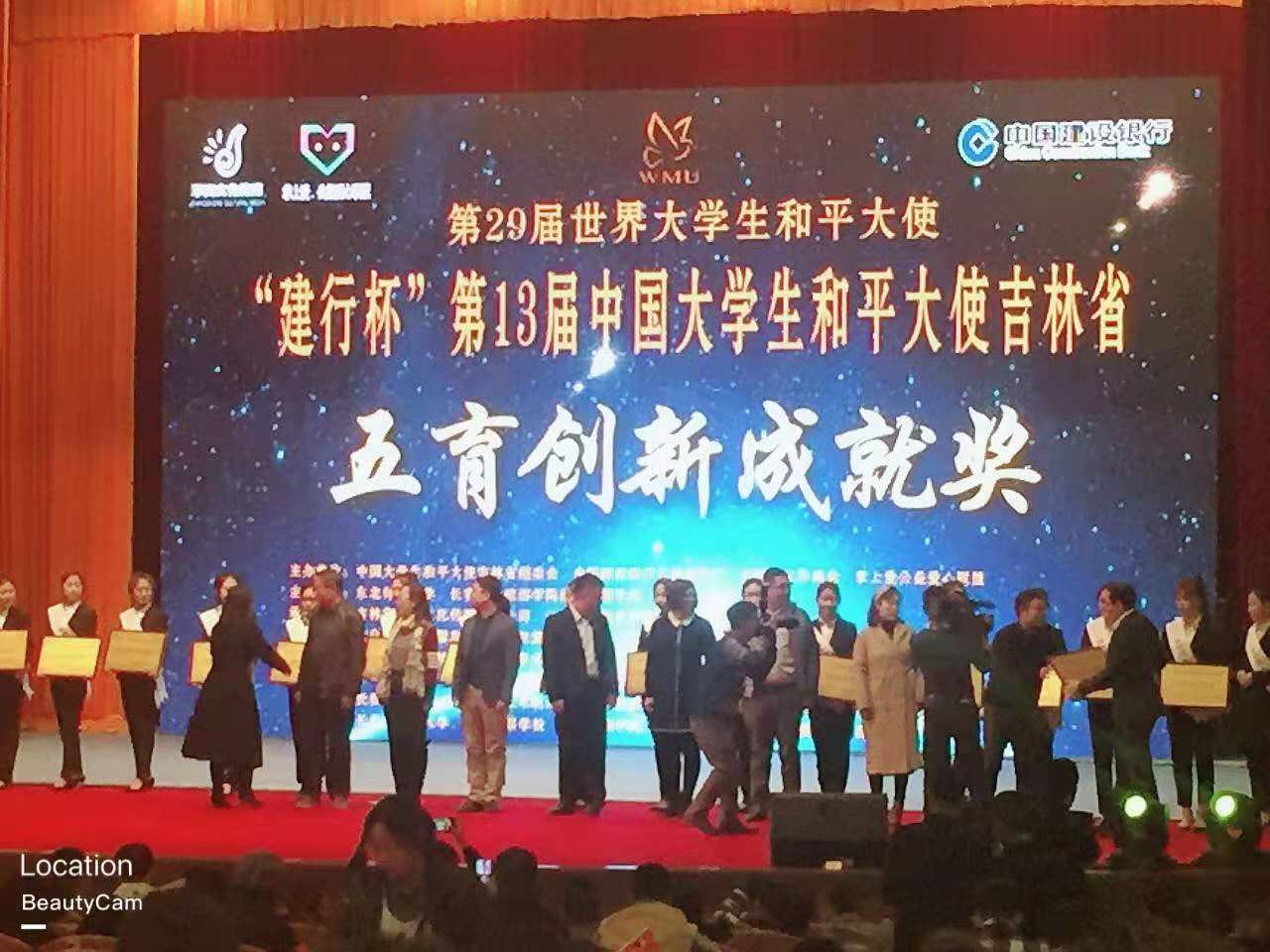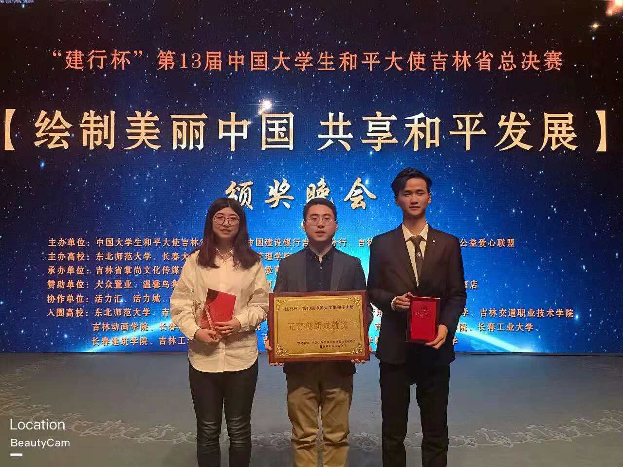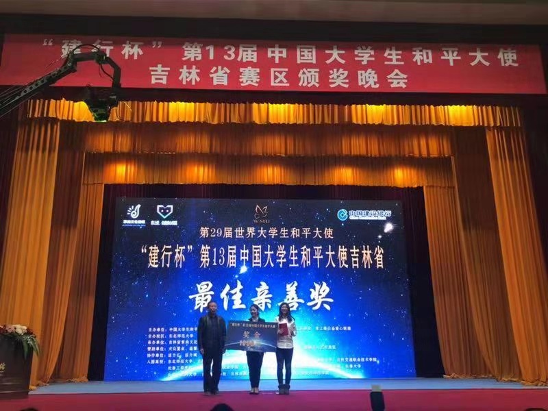 "建行杯"第13届中国大学生和平大使吉林省赛区颁奖晚会于2018年11月18日下午13时在吉林省宾馆举行。该赛事自1986年由联合国教科文组织下属的世界大学校长联合会倡议举办至今已在世界范围成功举办了28届,中国区已连续参与12届,大赛以“和平、慈善、公益、爱心”为主题,以青少年为对象,以引导世界青少年珍爱和平、共建友谊,增强世界青少年的公益意识与社会责任感为奋斗目标,培养弘扬“爱心慈善”奉献精神,弘扬爱与和平,向全世界传播“反战争、反恐怖、爱环境、爱生命”的和平讯息,为构建和谐社会,维护世界和平做出贡献。以综合素质选拔标准、和平公益理念为主题的国际性新赛事平台让首次参赛的吉林省及全国各高校大学生们兴奋不已。而经过层层激烈的选拔,我院参赛同学和指导老师均取得了优异成绩。