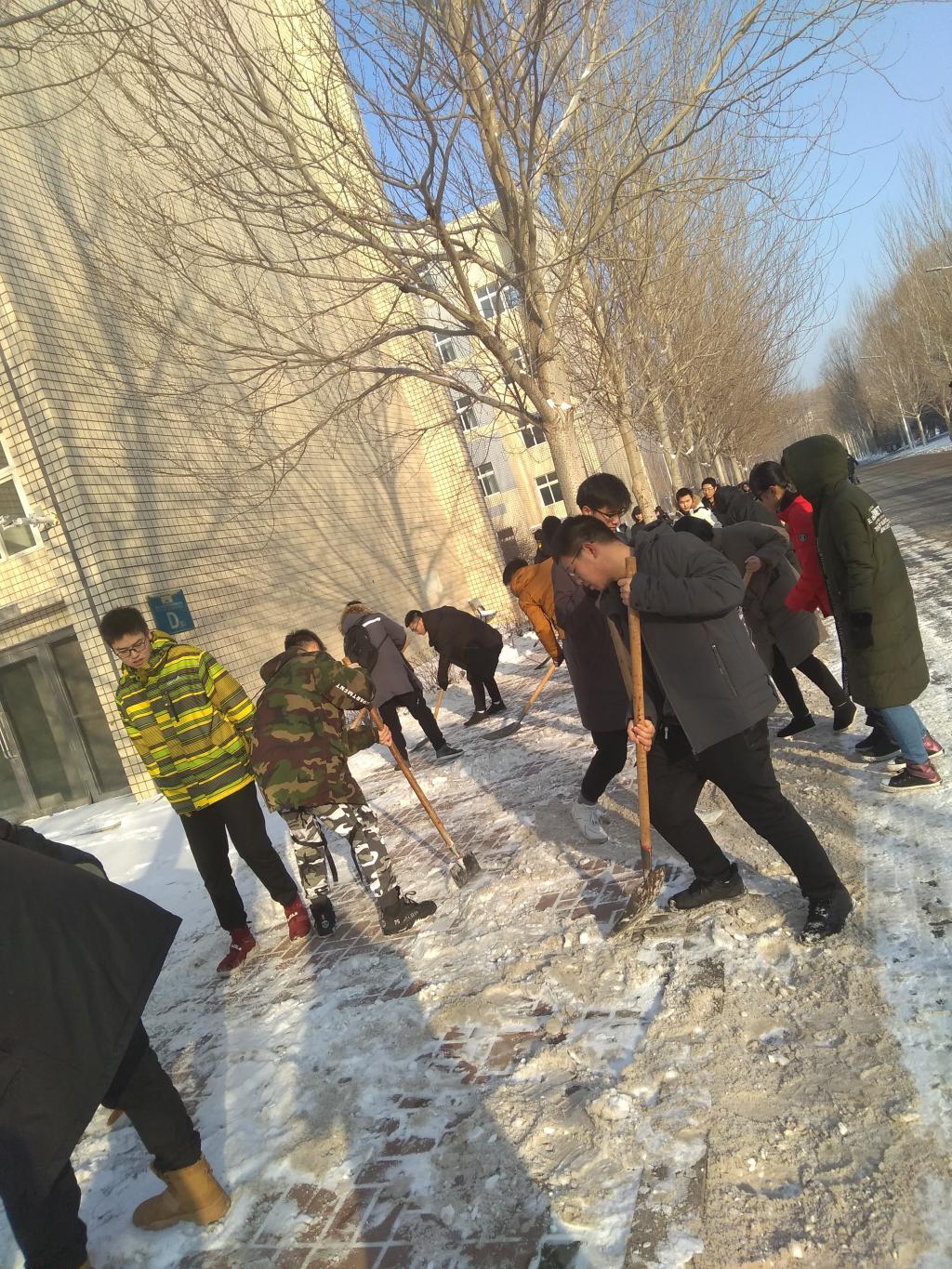 同往年相比,今冬的雪显得有些姗姗来迟了。一场大雪打乱了同学们原来的生活节奏,在雪花装点了美丽的校园的同时,路上的积雪布满了校园。虽然大雪净化了空气、美化了环境,但也给学校师生的出行带来了不便。为了确保师生人身安全,确保校园内道路及校门口道路畅通、校舍安全,维持正常的教学秩序,学院领导决定开启2018年度的校园扫雪工作。12月22日上午九点,凛冽的寒风和美好的周末时光没有阻挡住同学们热情的脚步。学院团学组织的学生干部和志愿者们带好工具在经信教学楼东侧准时集合。随后负责人给大家分配好任务,大家正式开始扫雪。即便迎着凛冽寒冷的北风,大家都发扬了不怕脏不怕累的精神,有秩序而认真地铲雪、扫雪,十分积极主动并且保质保量地迅速完成了所有任务,毫不闲散,活动现场充满一片劳动中的愉快欢欣。在大家共同努力下,迅速完成了扫雪工作。清理过的人行道上干净整洁,想到行人不必再担心雪地路滑的问题,同学们都露出了欣慰的笑容。