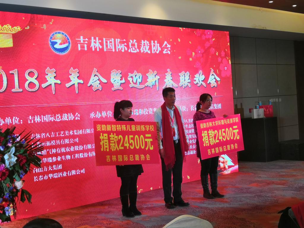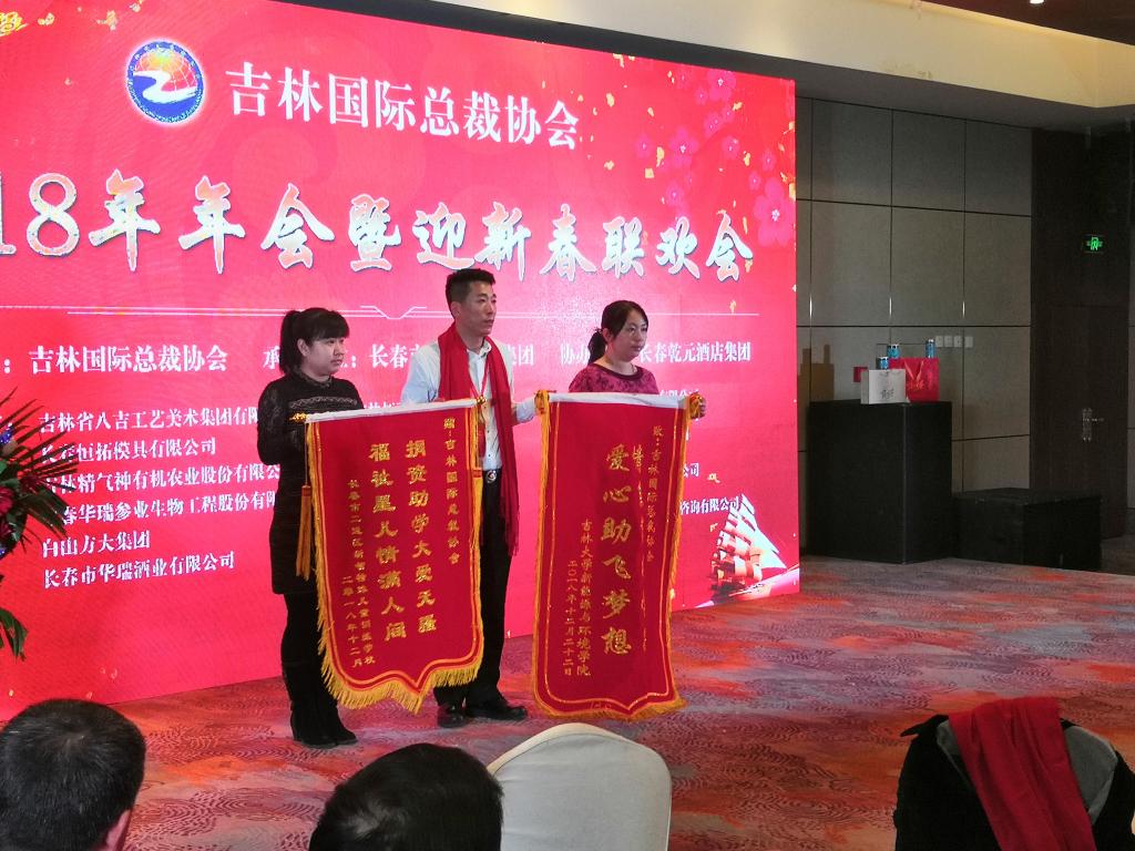 在当日吉林国际总裁协会换届会议结束后的吉林国际总裁协会2018年年会上,在协会对2018年度模范、先进、优秀活动的小组进行表彰后,吉林国际总裁协举行了对海角社区 的捐助仪式,捐助海角社区 24500元,由海角社区 党委副书记吴哲出席仪式,向吉利国际总裁协会赠送“爱心助飞梦想”的锦旗,并与负责人合影留念。一同参加该活动的还有海角社区 受资助学生代表两名。