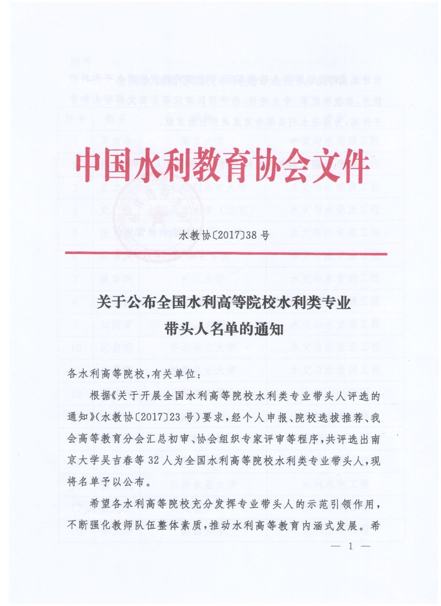 年中国水利教育协会组织的全国涉水高校水利类本科专业带头人评选工作中,评选为全国水利高等院校水利类专业带头人。