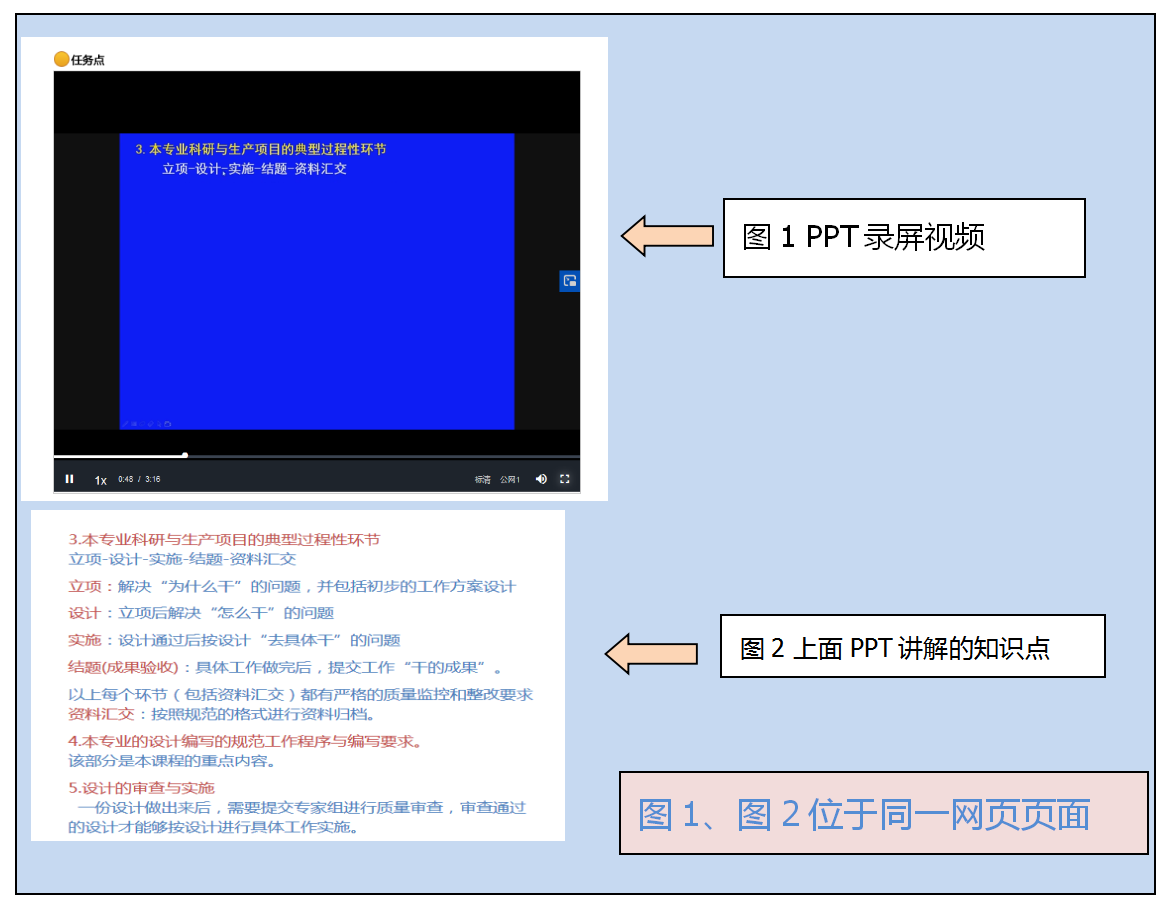 非直播网络课程的知识传递和呈现方式建议采用PPT录屏模式(图1)和知识点文字共同呈现的方式(图2)来替代单一的放一个PPT录屏文件的知识呈现方式。并且,要求图1和图2知识点共同处在同一网页页面(如下所示)。这样做的好处在于学生看视频前和之后,可以直观快速的掌握该节知识点要讲授的知识结构和整体情况,也便于其在看完一遍视频时,再看下面的知识点,检验自己是否真的理解了这些关键内容。学生学完一遍视频哪些没掌握可以直接对照网页下方(图2)的知识点直接快速拖曳视频播放起止位置,快速开始第二次学习。