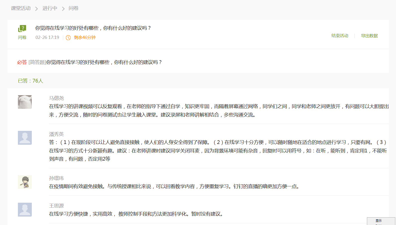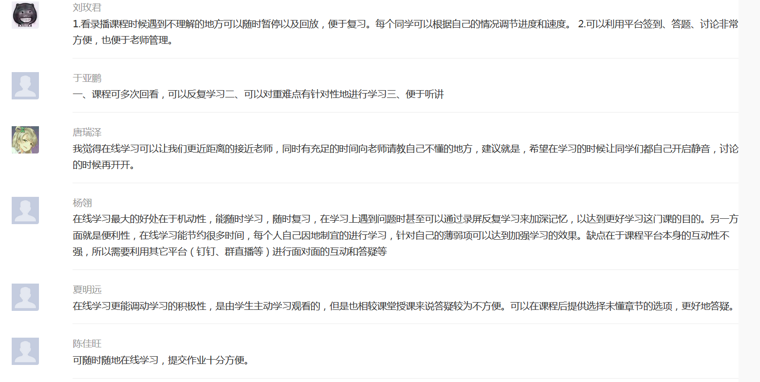 比如,我本次课程两节课结束后发起的活动为“你觉得在线学习的好处有哪些,你有什么好的建议”(图6)。从大家回复的结果可以看出各个同学的学习态度和积极性是很好的。一些学生确实提出来一些好的建议。这样可以让学生感觉自己也能为课程做出贡献,都会很高兴地投入下一次的学习中去。