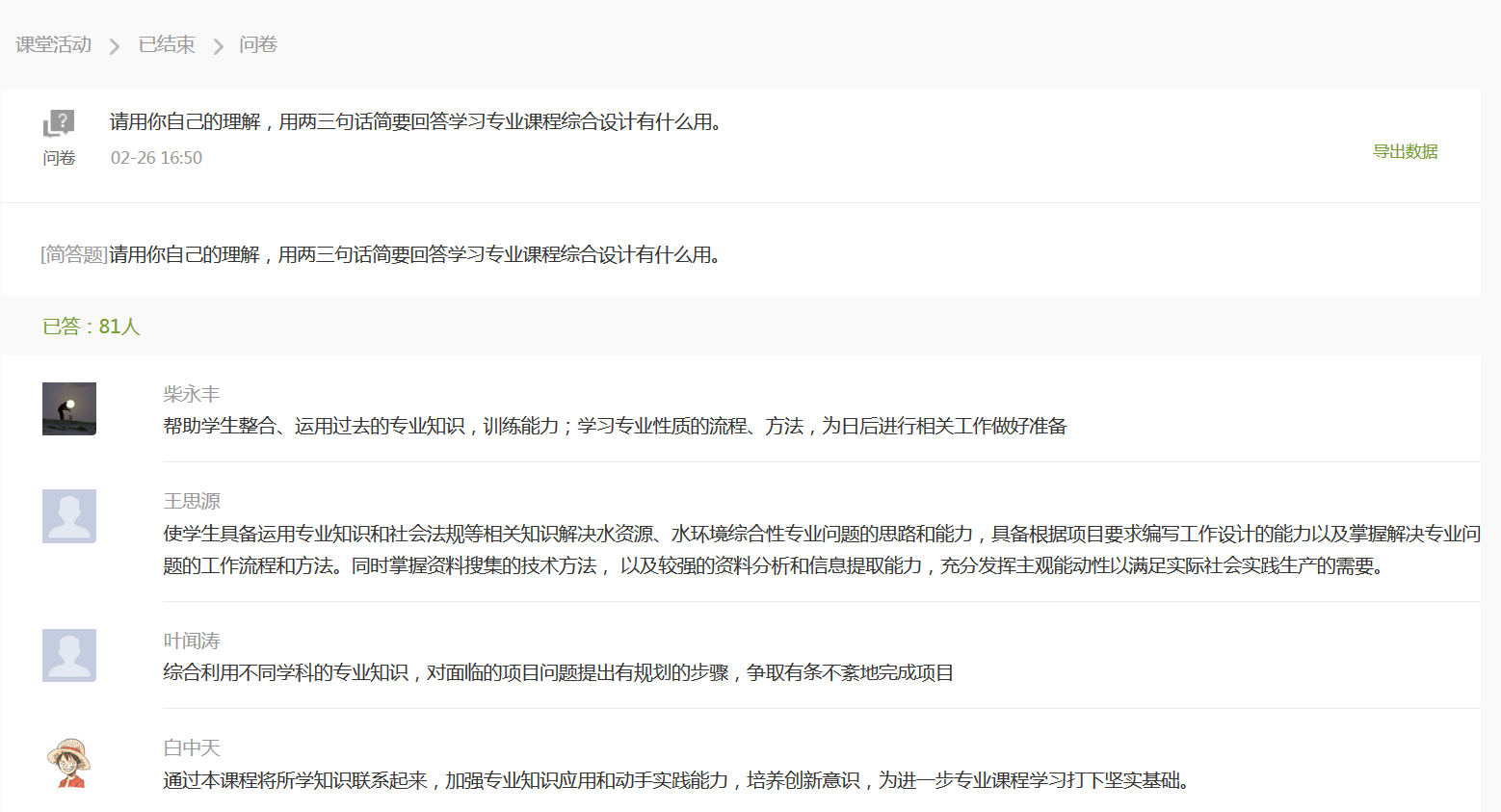 每一次改革都将给介入的人们以新的体会和认识。通过第一次网络授课学生互动结果看,确实很出乎个人的意料,大家学习兴趣昂扬,效果非常好(有没有可能是在家憋的太久的缘故尚待分析)。由此可见教学改革真的是应该与时俱进,不同的模式都有其优缺点,我们若能逐步在课程建设中兼优去劣,长此以往,每门课程都会成为一门精品的课程,都会成为一门“金课”。