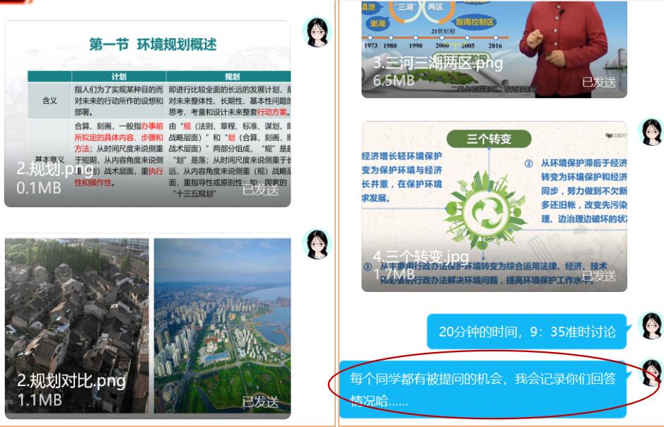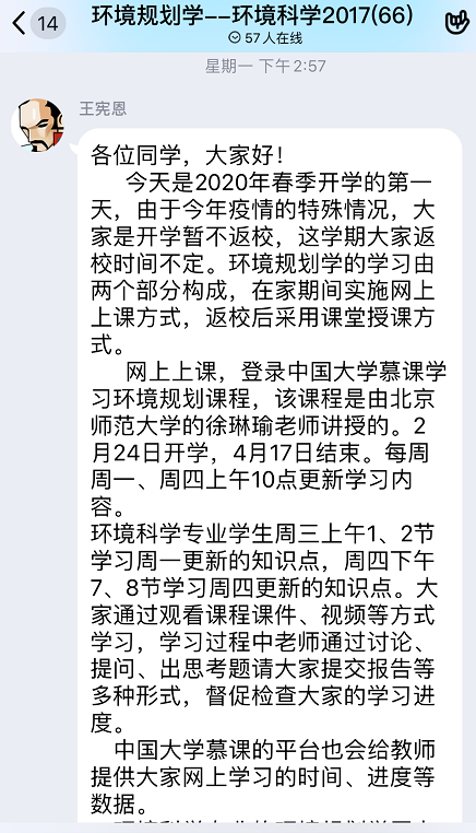 开课前,三位老师通过“微信视频会议”方式,商讨开课方式,确定使用“北京师范大学徐琳瑜教授的环境规划”在线慕课资源,并制定计划,研究如何督促学生积极学习,达成教学效果。
