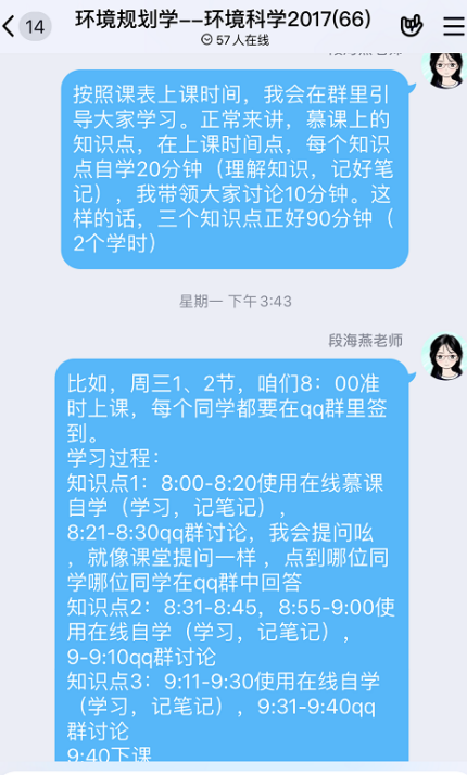 商讨后,确定按照教学计划,在教学课表规定的时间内采用“在线慕课+直播”的方式组织学习,即,针对每个知识点,先让学生在“中国大学慕课”平台上在规定时间内观看慕课进行学习;然后教师在规定的时间点通过qq发起群语音/视频通话,针对知识点进行补充讲解和提问,学生须在线上直接回答。一方面测验学生自学后对知识点的把握,便于教师补充,另一方面确保学生在这个时间段集中学习。由于现场提问,群内的其他同学同步收听,学生会认真学习和记笔记。