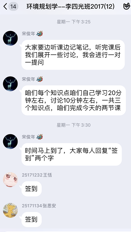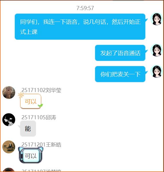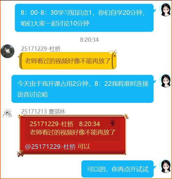 第二,上课时间到,教师准时发起群语音,说课2分钟,布置今天的学习任务,说明时间安排。学生在平台学习过程中,如果有问题,可以随时在群中询问老师,老师一直在线解答。