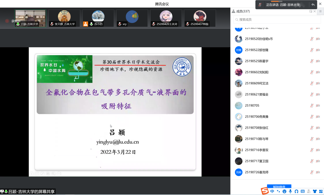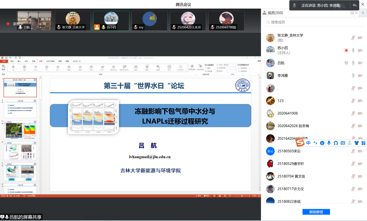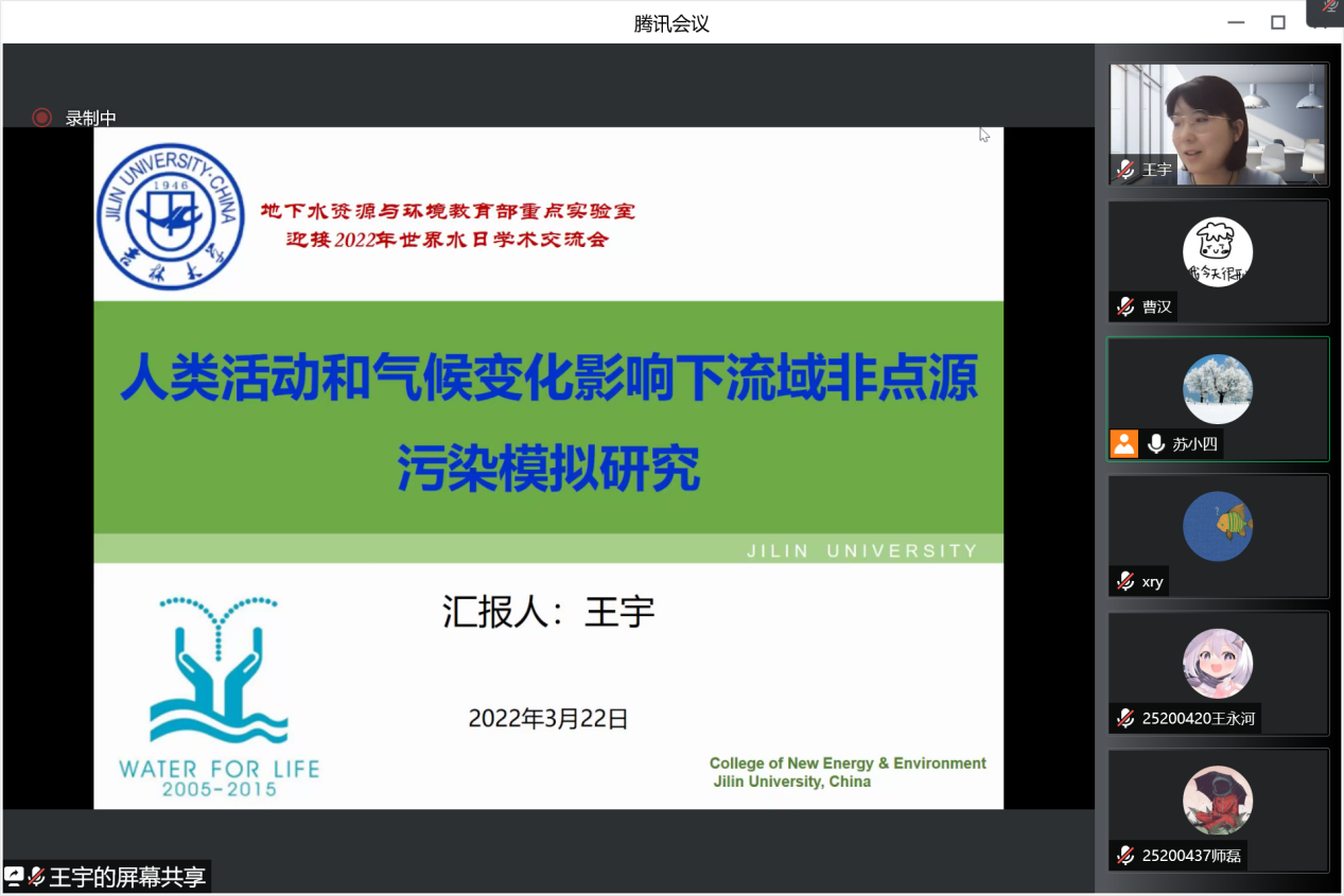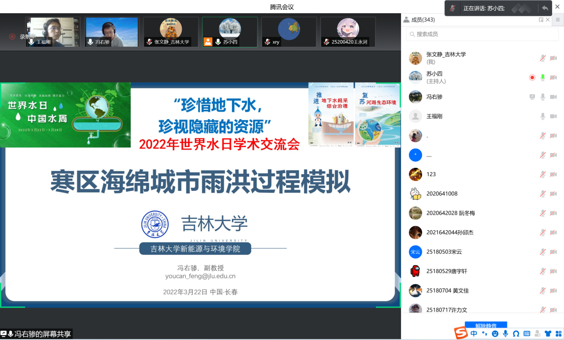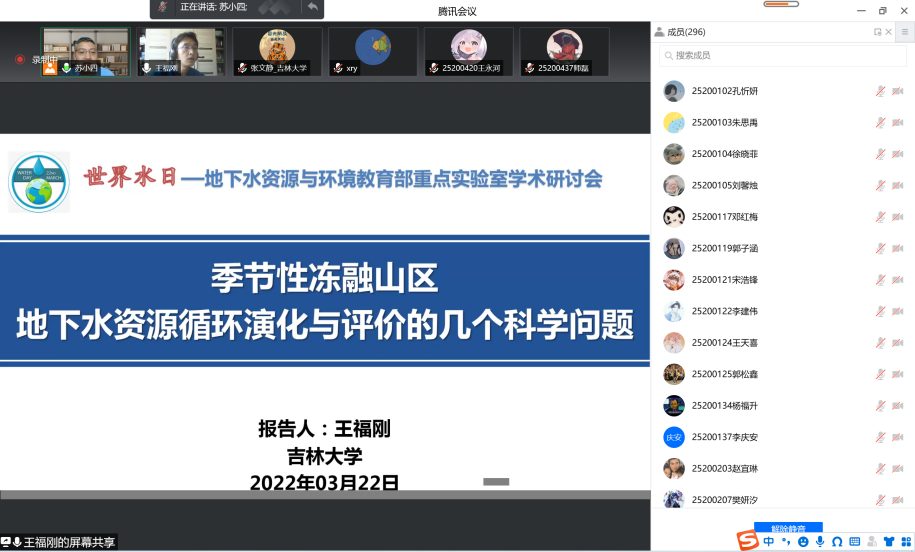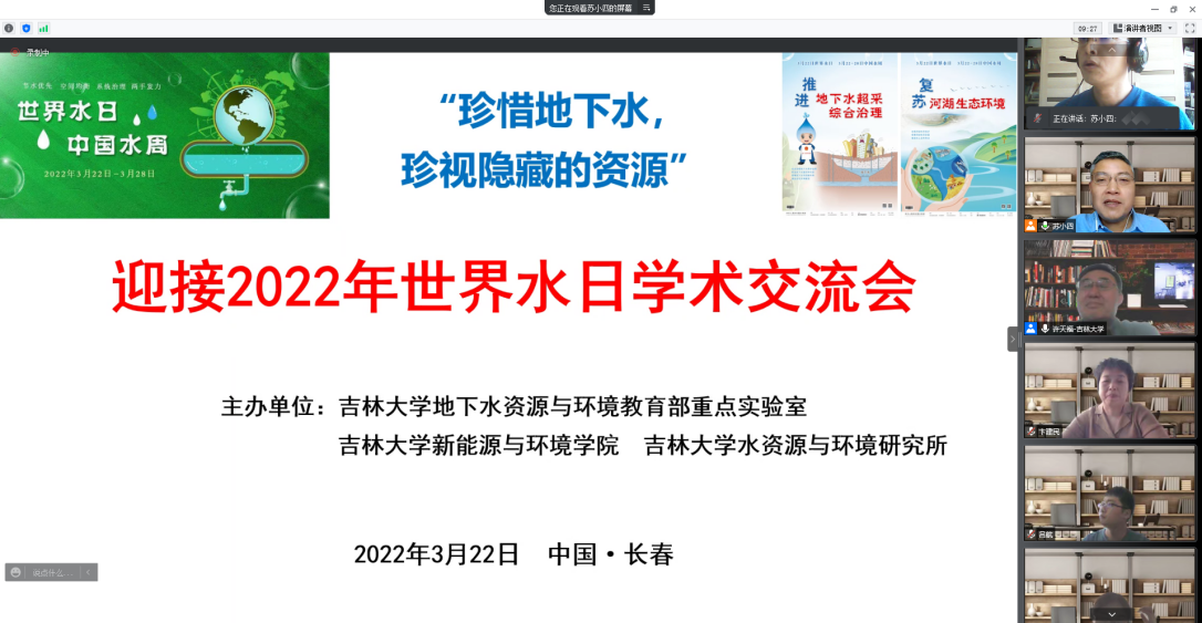 为深入落实习近平总书记“节水优先、空间均衡、系统治理、两手发力”治水思路,共同探讨地下水保护与利用的平衡之道,3月22日下午海角社区 、水资源与环境研究所与地下水资源与环境教育部重点实验室共同组织召开了迎接2022年世界水日学术交流会。会议由水资源与环境研究所所长苏小四教授主持,学院领导、相关教师和研究生、本科生同学350余人在线参加了此次学术交流。