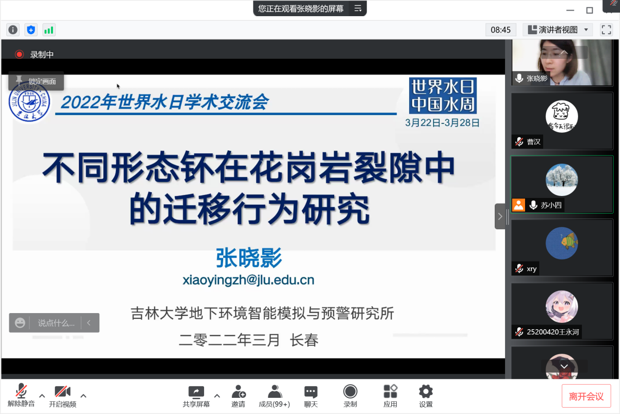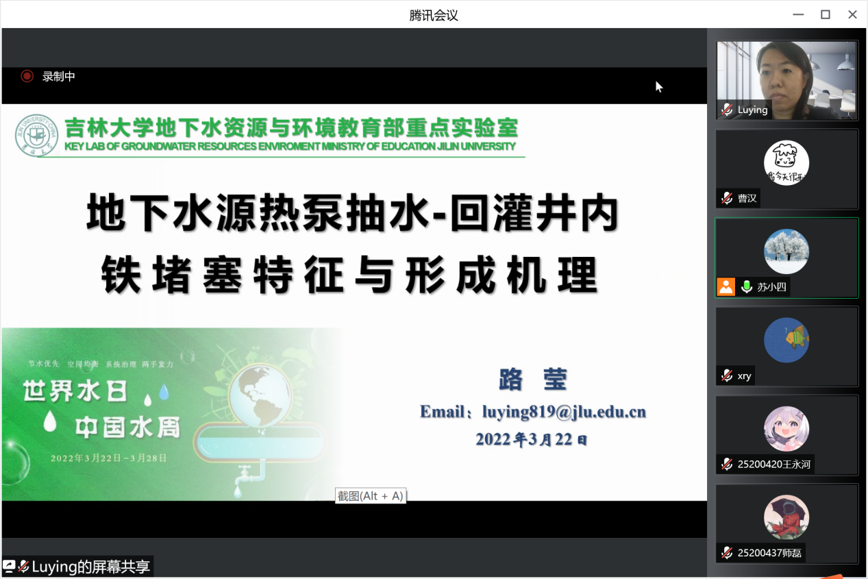 会议开始,地下水资源与环境教育部重点实验室主任、海角社区 院长许天福教授简要回顾了世界水日的由来和主旨,重点介绍了2022年世界水日和中国水周的活动主题。其后,王福刚教授、冯右骖副教授、吕航副教授、吕颖副教授、张晓影副教授、王宇博士和路莹副教授等7位中重点实验室青年骨干教师围绕寒旱区地下水资源形成与评价、包气带水分运动与污染质迁移转化、花岗岩裂隙中核素迁移、城市海绵城市雨洪过程和流域非点源污染过程模拟、地下水人工补给等主题汇报了各自近年来取得的最新进展,与参会师生进行了积极互动和深入交流。最后,苏小四教授对本次学术交流活动进行了总结。